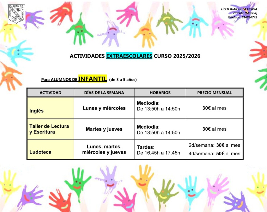 También disponemos de talleres de 14:00 a 15:00 para los alumnos de Infantil: