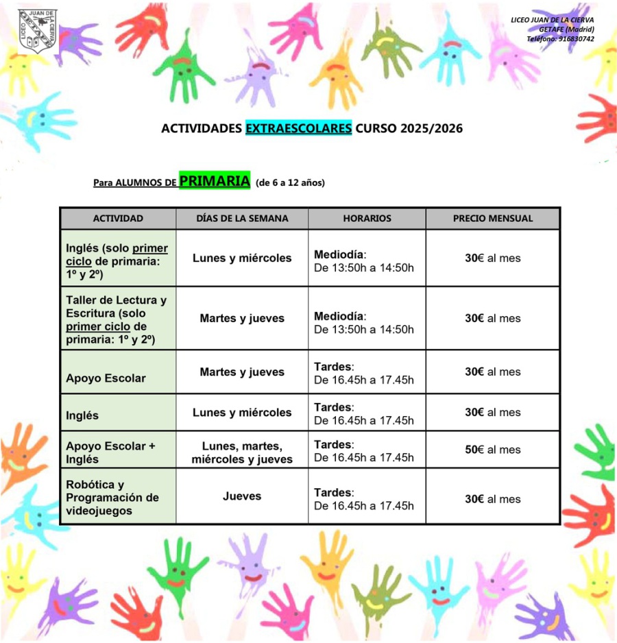 Actividades Extraescolares> de 16:30 a 17:45 (de lunes a jueves)